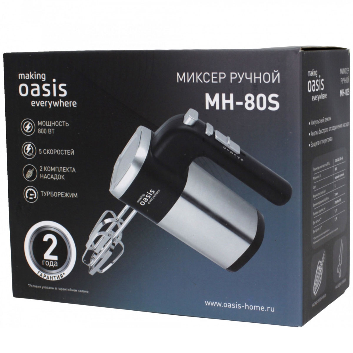 Ручной миксер making Oasis everywhere MH-80S – компактный, но высокопроизводительный кухонный прибор. За считанные минуты устройство превращает сливки в пышную пену, доводит яичные белки до устойчивых пиков и замешивает негустое тесто для блинчиков или кляра. Кроме того, можно готовить молочные коктейли или домашние соусы.