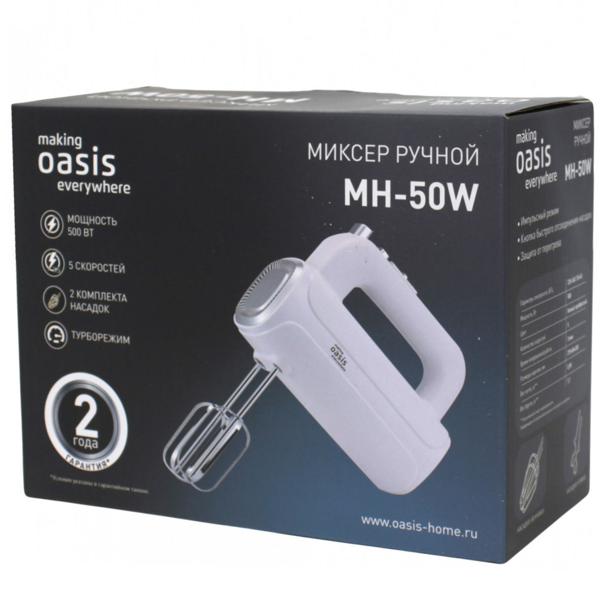 Ручной миксер making Oasis everywhere MH-50W – компактный, но высокопроизводительный кухонный прибор. За считанные минуты устройство превращает сливки в пышную пену, доводит яичные белки до устойчивых пиков и замешивает негустое тесто для блинчиков или кляра. Кроме того, можно готовить молочные коктейли или домашние соусы.