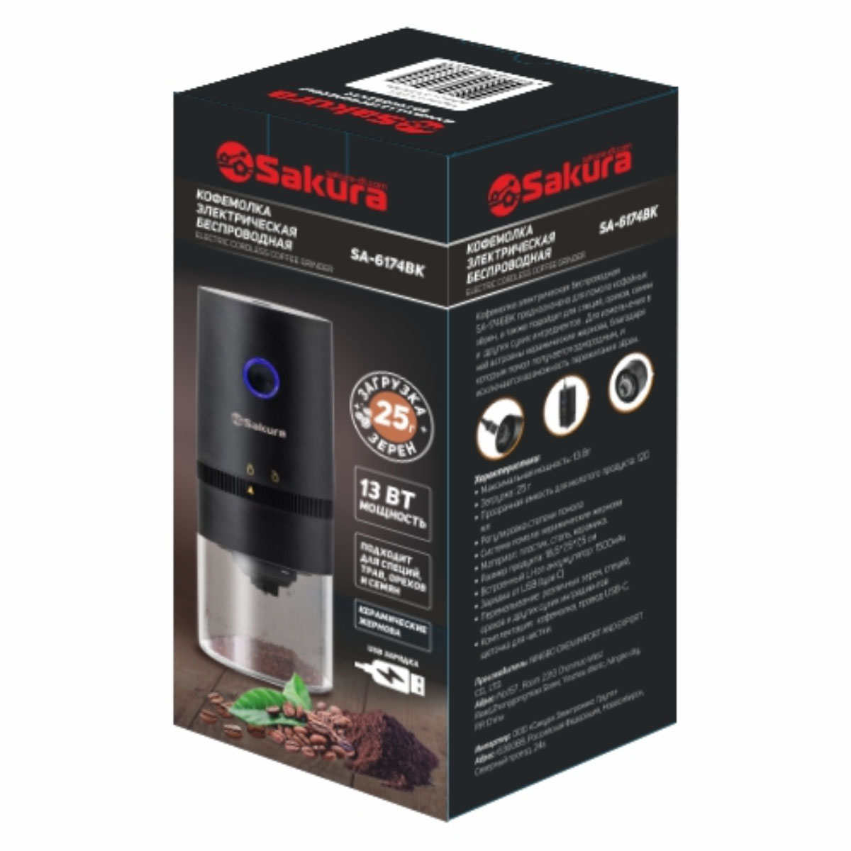 -Кофемолка эл. SA-6174BK, жернов аккум Li-Poli USB