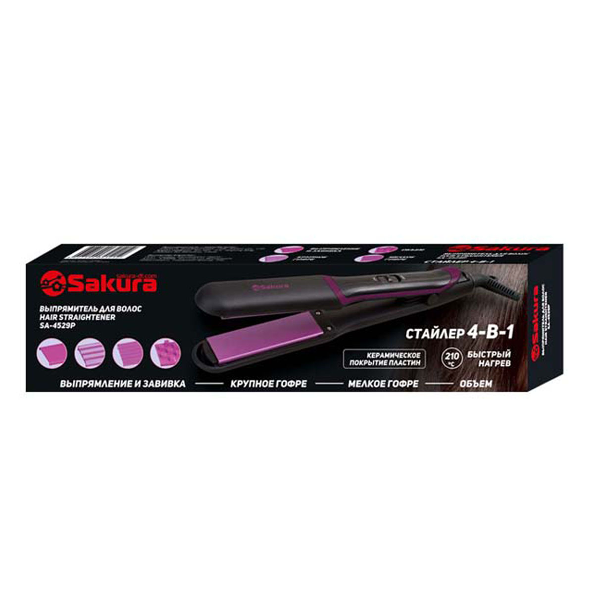 Выпрямитель эл. SAKURA SA-4529P, 40Вт, 4 пары насадок: для выпрям. и завивки, придания об., мел. и сред.гофре