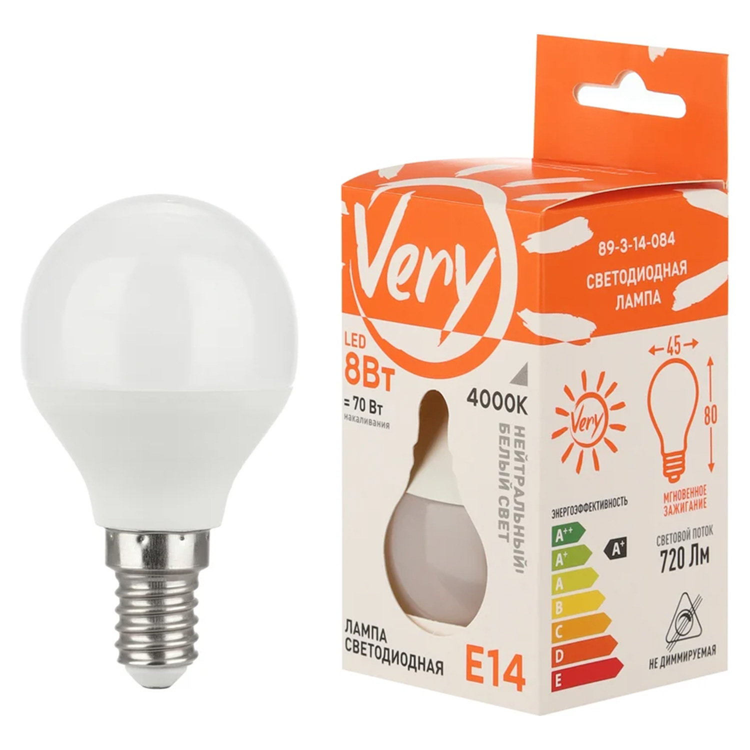 Лампа светодиодная шар GL45, 8Вт, 4000К, E14 89-3-14-084
