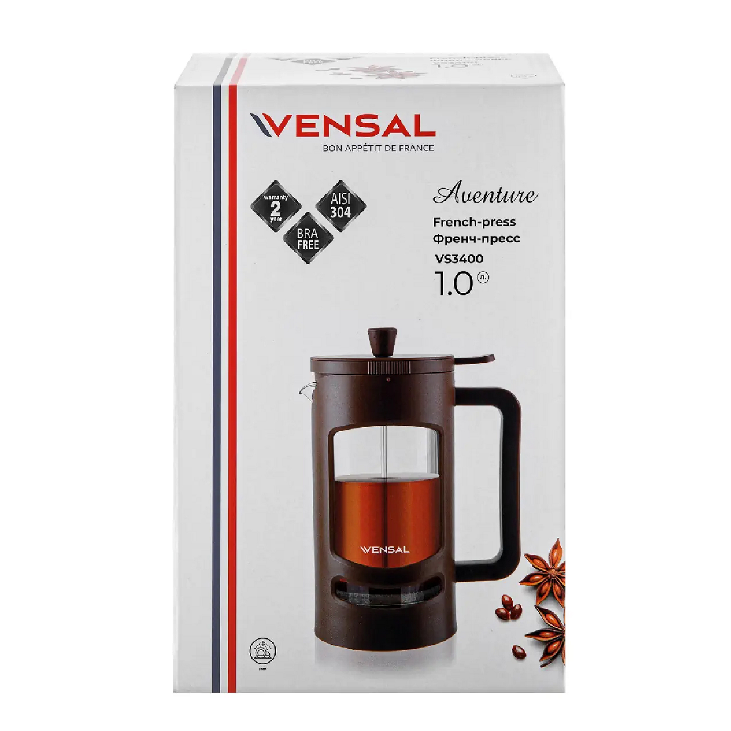 Френч-пресс 1000мл VS3400 нерж., боросиликат.стекло, пластик