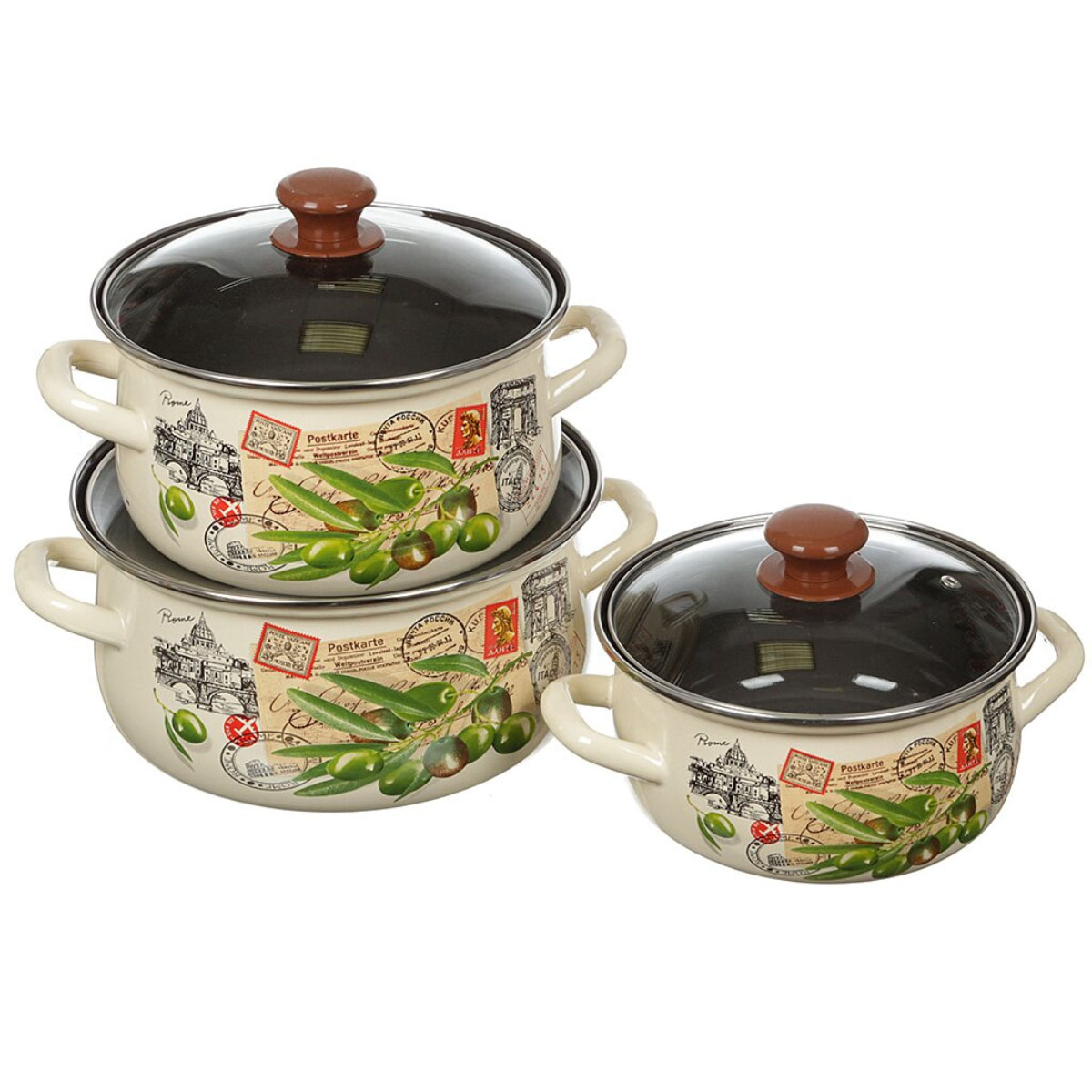 Набор посуды эмаль КМК "Римские каникулы-ЭКСТРА", 3 предмета, 2л., 3л., 4л.,крышка стекло, ручки литые, цилиндрическая форма, с декором, внутри чёрный, бежевый