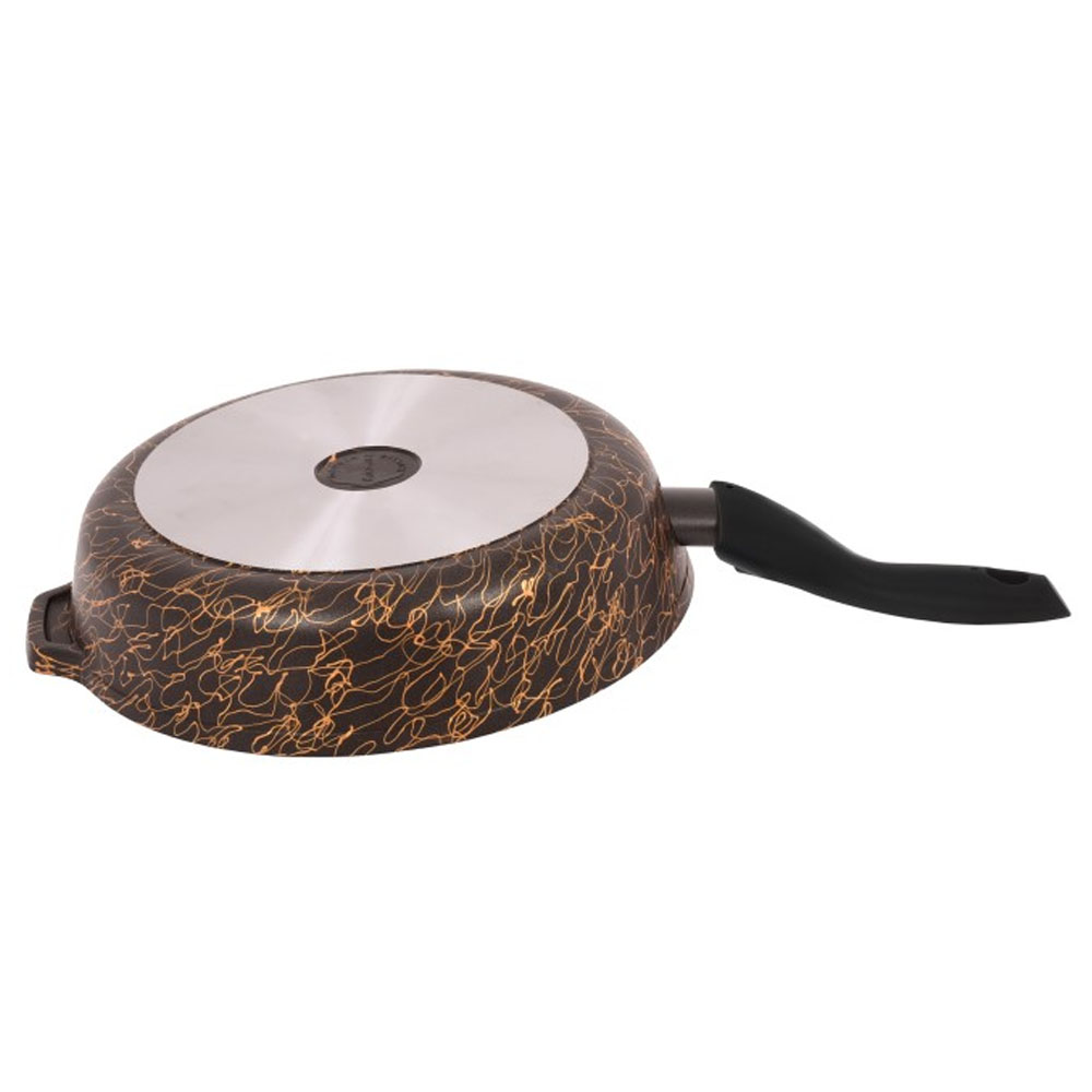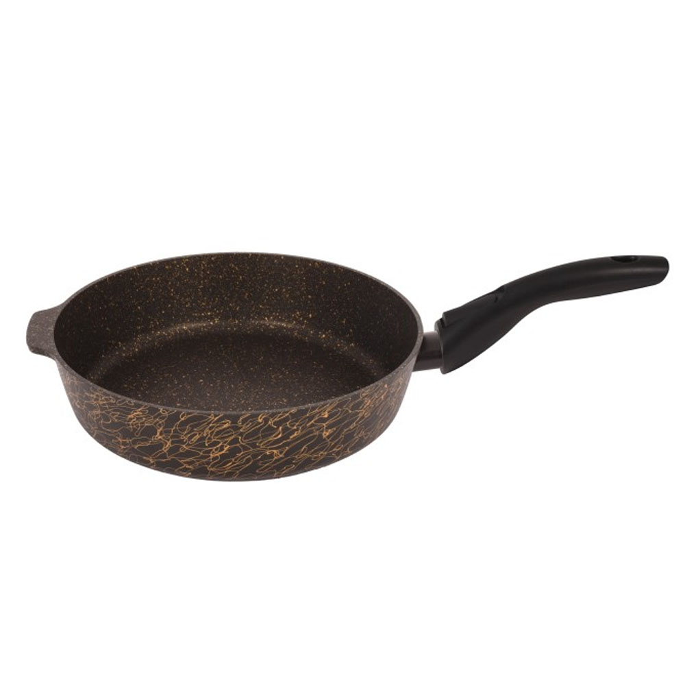 Съёмная ручка облегчает хранение и позволяет использовать сковороду в духовом шкафу (без крышки). Крышка из жаропрочного стекла удерживает тепло и влагу, сохраняя вкус и аромат блюд. Эффектный чёрно-золотой декор придаёт изделию премиальный вид.
